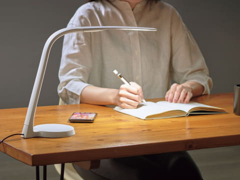 自由に動くフレキシブルアームを採用しており、明るくしたいところを確実に照らすことが可能。明るさは、シェード部のタッチスイッチで3段階(100/50/20%)に調整できる。