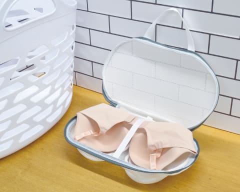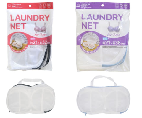 ブラジャーのカップを守り、平置きで洗える洗濯ネット。カップが当たる面にソフトフレームが入っており、カップを守るという。ブラジャーを固定するストラップ付きで、ネット内での偏りも防ぐことが可能。