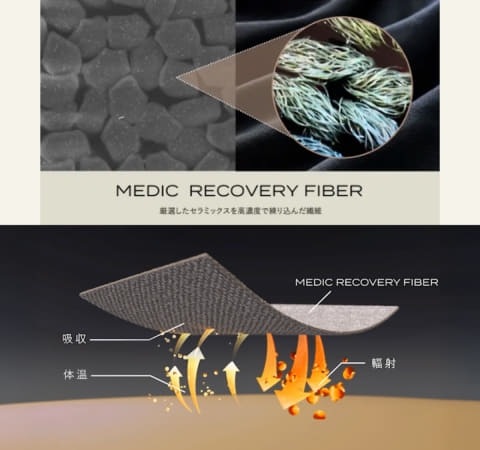 本素材は純度の高いセラミックスを数種類ブレンドし、繊維に高濃度で練り込んでいる点が特徴。さらに特殊な糸形状により、体温の吸収と遠赤外線放射を高めることで効果的に体を温め、血行を促進しやすくし、高いリカバリー効果を実現するという。