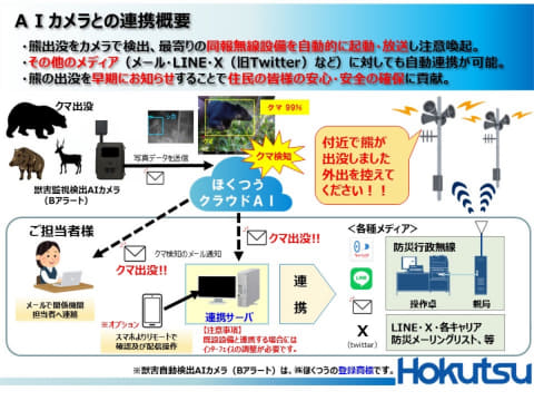 ほくつうは、同社の害獣自動検出AIカメラ「Bアラート」と、富山市の防災行政無線(屋外拡声器を介して役場から住民等に対して防災情報や行政情報を伝えるシステム)を自動連携するシステムを構築し、7月22日より実証実験を開始した。