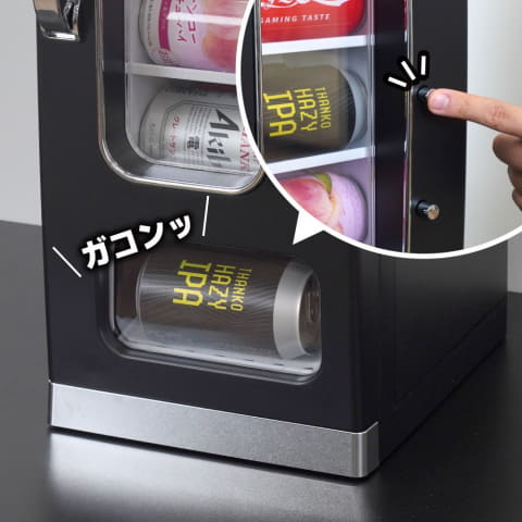 「マイ自販機」として部屋やデスク上に設置できるペルチェ式小型冷蔵庫。ボタンを押すと「ガコンッ」と缶が落ちてくるギミックを自宅で再現できるという。
