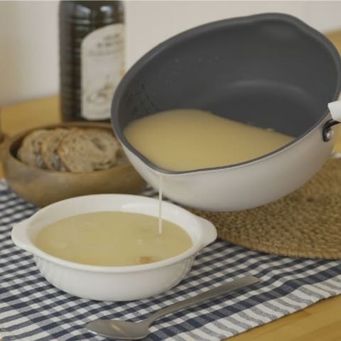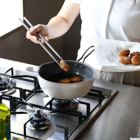 両側に注ぎ口が付いており、左右どちらの手でも扱いやすい。味噌汁の移し替えや揚げ油の処理もスムーズに行なえる。さらに、フチ高設計により油の飛び散りを軽減する。