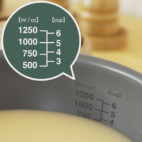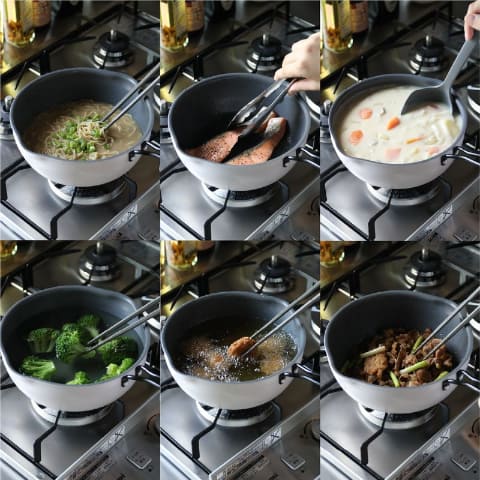 水や調味料を直接フライパン内で計量できるメモリ付きのフライパン。計量カップを使わずにそのまま液体を注いで調理が可能。煮る・焼く・炒める・茹でる・揚げる・湯を沸かすの6通りの調理が可能。対応熱源はIH(200V)、ハロゲン、ラジエント、シーズ、エンクロ、ガス火。