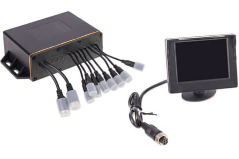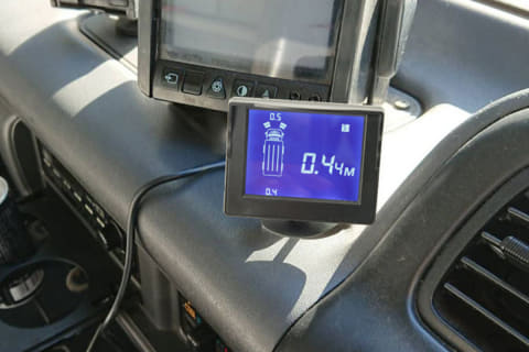 トラックやフォークリフト、普通自動車に4つのセンサーを取り付けて使用する、超音波式のバックセンサー。後方や周囲との距離を0~5mの範囲で計測。ディスプレイ表示とアラーム音で知らせる仕組みで、距離が近づくほどアラームの間隔が短くなり、音だけで距離感を把握できる。これにより、バック事故や屋根上接触事故を防ぐという。