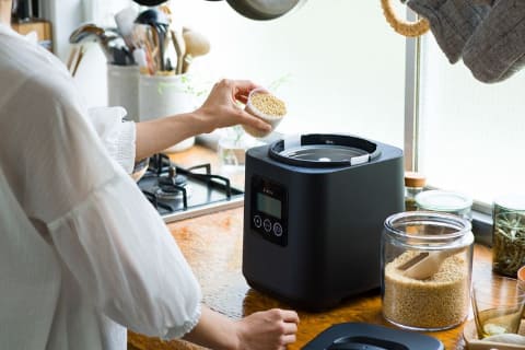 玄米から「たった2分半で新米のような味わいを叶える」という精米機。段階的回転制御の特許技術とダイレクト駆動モーターにより砕米率を2%以下に抑え、温度上昇を軽減することで、炊き上がりのおいしさを実現するという。静音設計とコンパクトなサイズで毎日使いやすくなっている。