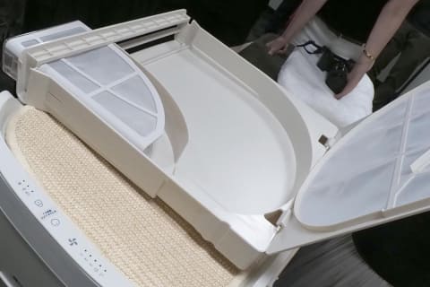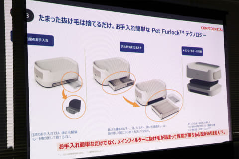 「Pet Fulockテクノロジー」を採用しており、ペットの抜け毛は専用トレーに捕集される。トレーを引き出して溜まった抜け毛を捨てるだけで、簡単にお手入れができる仕様だ。一般的なペット用ベッドのように掃除機で抜け毛を取り除く必要もない。トレーやプレフィルターは取り外して水洗いも可能だ。