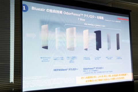 ブルーエアの基幹技術「HEPASilentテクノロジー」を搭載し、0.1μmまでの有害物質を99.97%除去する能力を維持しながら、新たにニオイに特化した最新技術「Odor Fenseテクノロジー」を導入。7層のフィルター構造により、アンモニア(トイレ臭)、アセトアルデヒド(生ごみ臭)、酢酸(体臭)といった生活臭の原因物質を99.99%以上除去できる。さらに、ペットの肌に存在し、かゆみや炎症の原因となるマラセチア菌を99.93%除去することも可能だ。