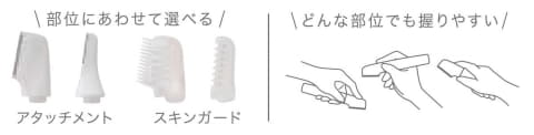 デリケートなVIOゾーンから顔・身体まで1本でケアできるシェーバー。アタッチメント2種とスキンガード2種を各1個付属する。握りやすい形状のほか、丸い刃先を採用し、肌を傷つけにくいやさしい使い心地で、しっかりとした剃り味を実現したという。