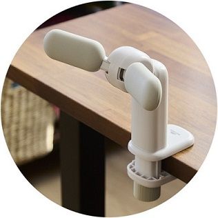 机の天板に挟むクランプ式で簡単に取り付けられる。高さは13~16.5cmで、8段階調節。角度は90、105、120度の3段階に調節可能。