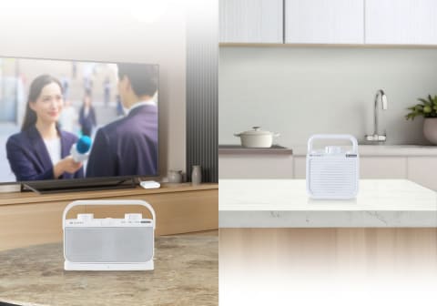 1台の送信機から本体と増設用子機に同時に音声を送信できるテレビ用スピーカー。リビングでテレビを見ながら、キッチンで作業をする家族も、途切れなく同じ音声を聴くことができる。