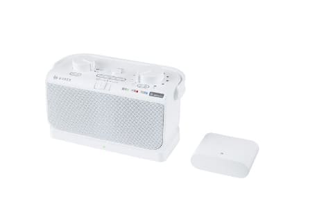 増設用子機「AX-WST1EX」は、スピーカー直径52mmで実用最大出力2W、連続動作時間約10時間、充電時間約2.5時間。電源はUSB Type-Cポートで給電。イヤホン端子も装備。IPX2相当の防水性能を備える。