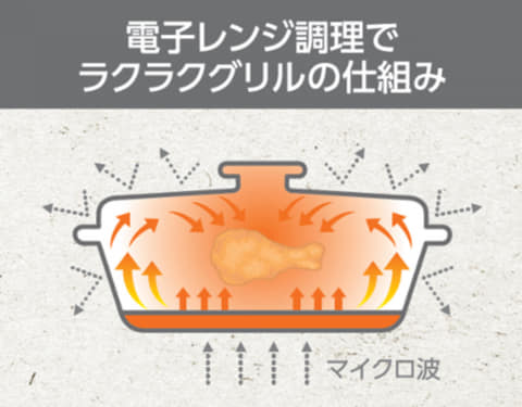 同シリーズは、焼く・炒める・蒸す・茹でる・炊く・煮る・温めるという7つの調理法を1台でこなせるマルチ調理器具。電子レンジで加熱するとプレート自体が発熱し、フライパンで調理したような仕上がりになるのが特徴だ。さらに蓋をした状態で加熱することで、食材に直接マイクロ波が当たらず水分が保たれ、肉や魚は外は香ばしく中はふっくらと、野菜はシャキッとした食感に仕上がるという。