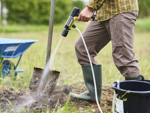 ペットボトルやバケツから給水でき、バッテリー充電式で外出先で使用可能。アウトドアやレジャーなど様々なシーンで靴や道具の洗浄ができる。作動時間は最大約30分で、充電時間は3時間。