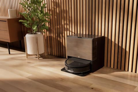 充電ステーションには、従来の機能にルンバ初の温水によるローラーモップ洗浄機能を追加。デザイン面では木目調のプレートを採用した。