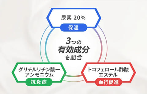 主成分には、硬くなった角質をやわらかくし、水分を保持する尿素を20%配合。さらに皮膚の炎症を抑えるグリチルリチン酸一アンモニウムと、血行を促して皮膚の代謝を助けるトコフェロール酢酸エステルを組み合わせ、爪まわり特有の症状に多角的にアプローチする。