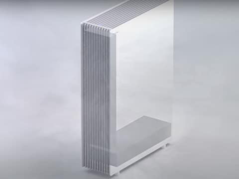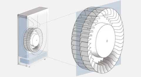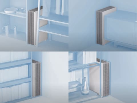 これらの構造により設置面積を従来比で約1/2に削減、設置制約スペースは約1/3とした。本体とわずか2cmの隙間を空けることで家具の隙間や壁際にも設置が可能で、レイアウトフリーな空気清浄機を実現した。