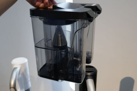 JC-HG1Aの充電スタンドには容量1.8Lのゴミ収集ドックを備える。掃除機本体が集めたゴミを回収し、約2カ月分のゴミを溜めておけるため、こまめなゴミ捨ての必要がなく、メンテナンスの手間を軽減できる。ドックは紙パックレス式。