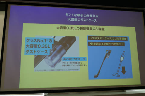 本体のダストケース容量はクラスNo.1という0.35L。さらに「タフバッテリー」の採用により、最長約35分の連続標準運転が可能。ゴミ捨て頻度を低減し、吸引力を維持しながら、家中をしっかり掃除できるという。