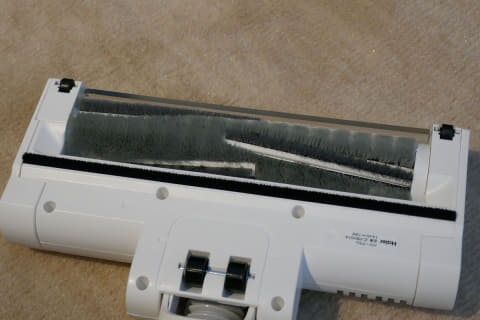 掃除機本体の仕様は両モデル共通。パワフルモーターと、3種類の素材でゴミをしっかり絡め取る「ホールドパワーブラシ」によって、カーペットの奥に潜むゴミまでしっかりかき出し、99%以上のダストピックアップ率を実現している。吸い込んだゴミを中央の吸引口に誘導することで、髪の毛やペットの毛を絡みにくくする設計を採用する。