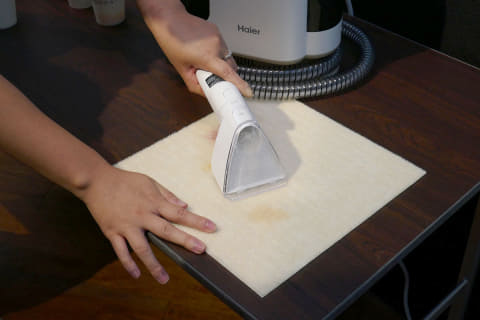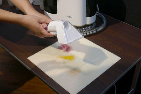 タンクに入れた水をノズルから噴射し、布製品に染み込んだ汚れを浮かせる。浮き上がった汚れをブラシでかき出し、最大15,000Paでパワフルに吸引。ベビーカーのシートやカーペット、ぬいぐるみなど、水洗いが難しい布製品を繊維の奥まで洗浄するという。窓ガラスの洗浄にも対応。
