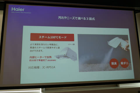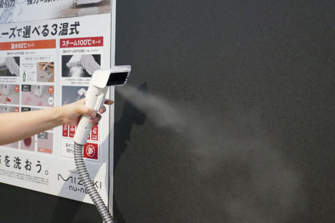 さらに「JC-RPS1A」には「温水60℃モード」「スチーム100℃モード」を搭載。温水60℃モードは、水をヒーターで温めることで常温では落ちにくい油溶性の汚れに対処。スチーム100℃モードではノズルから高温のスチームを噴射することで、タバコやペットの尿などのニオイを約99%脱臭、約99%の殺ダニ効果も確認されているという。