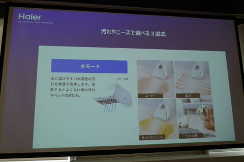 ジュースやコーヒー、液体調味料といった水溶性の汚れや、加熱したくない卵やペットの尿などが付着した場合には「水モード」で洗浄。ダニの吸引にも効果的としている。
