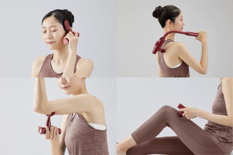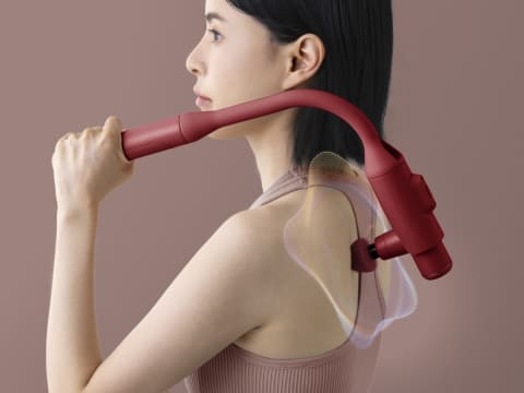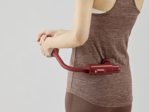 手が届きにくい背中や腰も、楽な姿勢でケアできる専用アーム付きハンディガン。体に押し当てた際にアームがバネのようにしなり、体にしっかりフィット。軽量設計なうえアームグリップへの振動も少なく、長時間使用しても手が疲れにくいという。