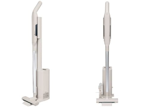 スティッククリーナーの本体サイズは235×210×1,060mm(幅×奥行き×高さ)、重さは1.1kg。リチウムイオン充電式バッテリー 11.1Vを内蔵。充電時間は約4.5時間。連続使用時間は約9〜20分。電源コード長は約1m。クリーナー集塵容量は約70ml、集塵ステーション集塵容量は約800ml。2in1すき間ノズル、2in1すき間ノズルホルダー、紙パックを付属。