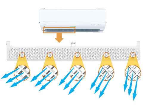 風当たりを和らげる「無風感ルーバー」を、新形状にしたうえで搭載している。同機能は、吹き出し口に搭載している「無風感ルーバー」にある無数の穴を通り抜けた気流と、通常の気流がぶつかることで風を拡散し、風当たりを和らげる技術。