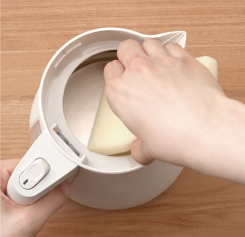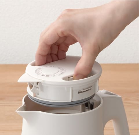 ワンタッチで簡単にふたを取り外せる「らくらく着脱ふた」を採用。ふたを外すと、広口のため内容器の奥までしっかりと手を入れて洗うことができる。また内容器の外側だけでなく、内側にも水量の調整がしやすいよう目盛がついている。
