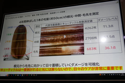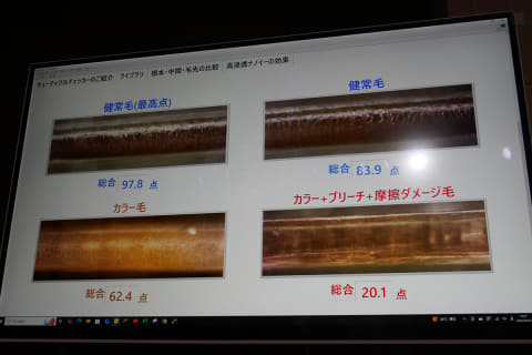 目安として表示されていた測定結果は、健常毛が97.8点(最高点)と83.9点、カラー毛は62.4点、カラー+ブリーチ+摩擦ダメージ毛は20.1点。4年間伸ばした髪の例では、根元のキューティクル枚数が4,264枚だったのに対し、毛先は683枚にまで減っており、日々蓄積していくダメージが可視化される結果となっていた。