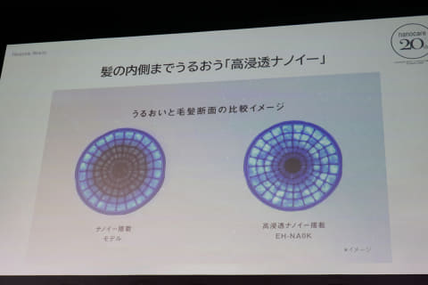 ナノケアは髪の内側までうるおうという「高浸透ナノイー」を搭載している点が特徴。髪にツヤやまとまりを与えるだけでなく、髪の水分バランスを整えることで“うねり”を抑制し、スタイリングしやすい髪へと導く。