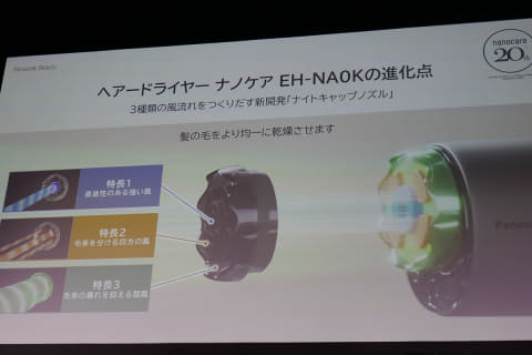 新発売の「EH-NA0K」は、夜のヘアドライ時に使用することで翌朝の寝ぐせを抑える「ナイトキャップノズル」を搭載。ノズルが風の流れをデザインすることで、髪を広げてほぐしながら均一に乾かすことができ、寝ぐせの原因となる乾かし残しを防げる。