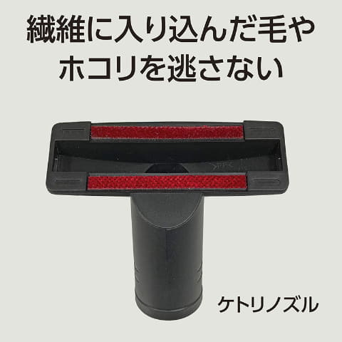 ペットの抜け毛や繊維に絡んだホコリをかきとる「ケトリノズル」と、サッシなどの隙間や小物の周りを掃除するブラシ付きの「2WAYノズル」が付属。用途に合わせて簡単に付け替えられる。
