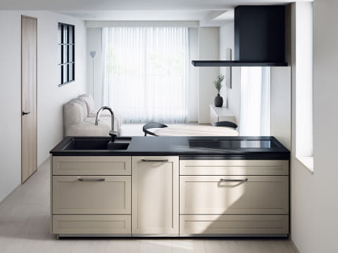 同社が提唱する“キッチン最新三種の神器“、「フラットワイドコンロ」「フロントオープン食洗機」「ラウンドアクセスシンク」を搭載。間口は、従来の2,550mmプランから幅を約10%縮小。それでも、従来比で約1.8倍の調理スペースを実現している。