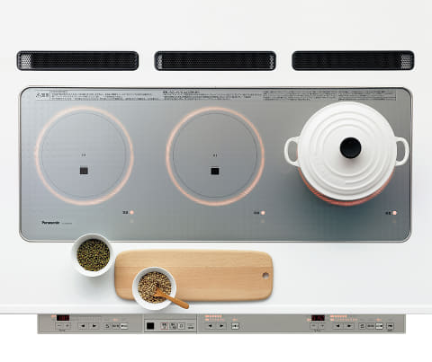 「フラットワイドコンロ」は、コンロが横に3つ並んでいるため、2人並んでの使用や、対面側からもアクセスできるため3人でも同時に調理可能。