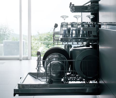 「フロントオープン食洗機」は、カトラリートレイ、上カゴ、下カゴの3段構造で、9人分の大容量を収納可能。ヒーター乾燥機能とナノイーXによる脱臭機能付きで、日常使いの食器収納庫としても活用できる。