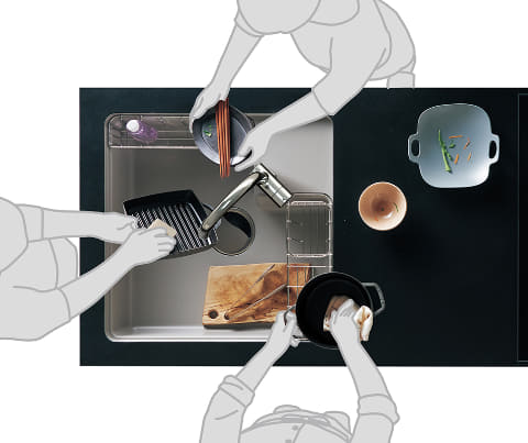 「ラウンドアクセスシンク」は、幅がコンパクトながらも、奥行を拡大して一般的なシンクと同等の面積を確保。対面キッチンの従来シンクにおいて、アクセスできるのは2方向から。一方、今回のシンクは3方向からアクセス可能なため、下ごしらえや片付けの効率が、大幅に向上するとしている。