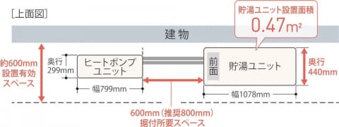 一方、屋外設置の貯湯ユニットが必要なため、都市部を中心に設置が困難になるケースがあった。今回の薄型モデルは、貯湯ユニットの奥行が44cmとコンパクトで、約60cmの有効スペースがあれば設置可能と、狭小地でも設置しやすい。