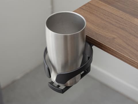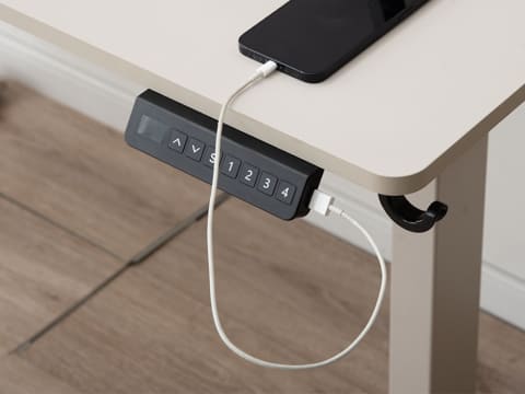 昇降操作パネルの横にはUSBポートを備えるほか、ヘッドフォンやバッグを掛けられるフックや、ドリンクホルダーを付属。