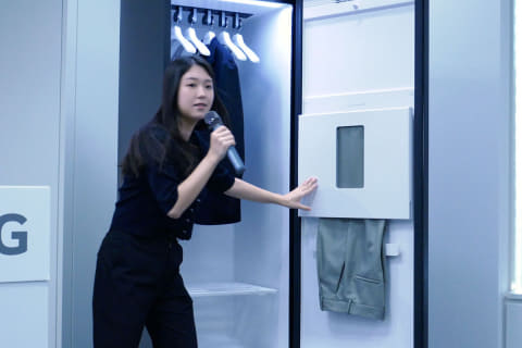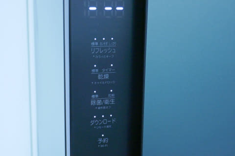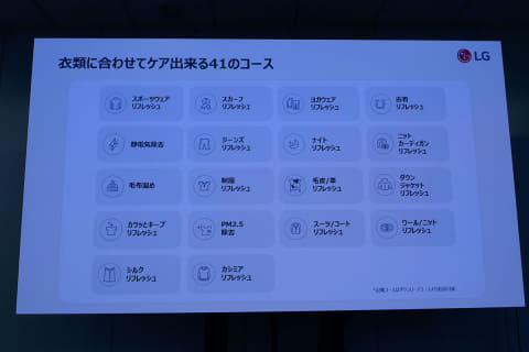 本体に標準搭載するコースは「リフレッシュ(標準/おいそぎ/しっかり)」「乾燥(標準/タイマー)」「除菌衛生(標準/花粉)」。このほか「スーツ/コートリフレッシュ」「ウール/ニットリフレッシュ」など全41コースを用意しており、本体に搭載しないコースは専用アプリ「LG ThinQ」からダウンロードして利用可能。ダウンロードコースは最大3つまで本体に登録しておける。