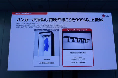 さらに、ハンガーにかけた衣類を振動させる「Dynamic MovingHanger」が、花粉やホコリを除去しながらシワも伸ばす。ハンガーは左右だけでなく立体的に動き、1分間に350回スイングする。