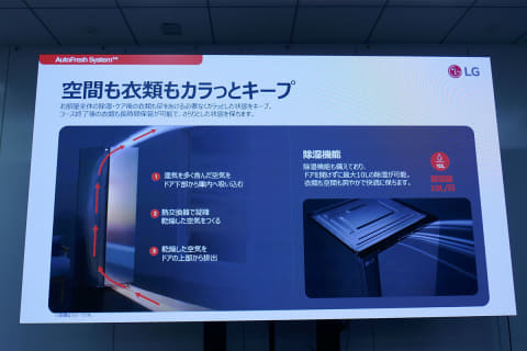 衣類のケアだけでなく、部屋の除湿が可能な点も特徴。本体下部から空気を吸い込み、上部から乾燥した空気を排出することで、本体ドアを閉めたまま24時間で最大10Lの除湿ができる。なお、排水タンク容量は1.5L。