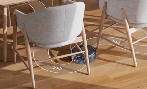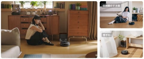 本体も大幅に小型・薄型化され、家具の脚が林立するリビングや床に物が多い環境でも自在に走行可能。一般的なサイズのロボット掃除機(直径35cm前後)では入り込めない隅々まで掃除ができるという。