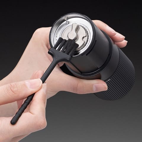 ステンレス刃のコーン式グラインダーを採用。粒度が揃い挽きムラが少ないため、豆本来の風味を引き出し、スペシャルティコーヒーの味わいをバランスよく抽出できるとする。コーヒー豆の容量は25gで、一度に約2〜3杯分を挽ける。