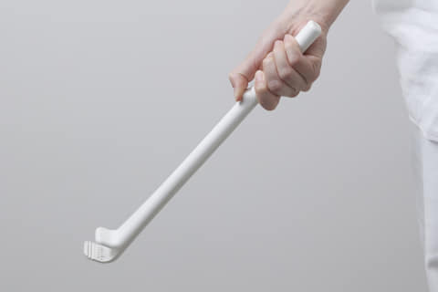 使い捨てシートや流せるタイプのトイレブラシをクリップのようにワンタッチで挟んで使用し、そのまま捨てられるコンパクトな掃除道具。柄の先端には突起があり、シートをしっかり固定できる構造になっている。