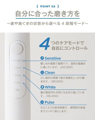 ブラッシングモードは、やさしめの振動の「Sensitive」、少し強めの振動の「Clean」、着色汚れが気になる時に使用する「White」、たたくような音波振動の「Pulse」の4種類。30秒ごとに振動で知らせるタイマー機能により、2分間の正しいブラッシング習慣を自然にサポートする。