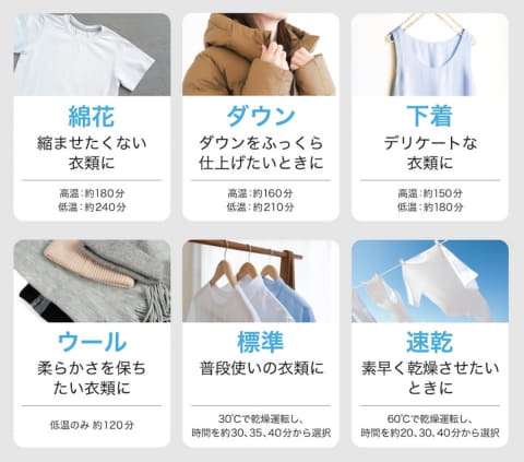 素材や用途に合わせて選べる6つのモードを搭載しており、デリケートな衣類からダウンまで幅広く対応。乾燥容量は3kgで、シャツ6〜8枚/ジーンズ4〜5本/タオル13〜15枚などを一度に乾燥できる。