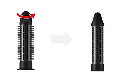 アタッチメントのスタイリングブラシを使えば、ボリュームアップや毛先のカールなど、多彩なアレンジが可能。ブラシピンは先端を回すだけで格納でき、髪の絡まりが防げるという。