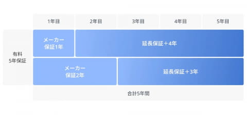 通常1年または2年のメーカー保証期間が終了した後も、最長5年間にわたり、対象製品の保証が受けられるサービス。例えば、メーカー保証が1年の製品の場合は4年の延長保証、同じくメーカー保証が2年の製品は3年の延長保証となる。